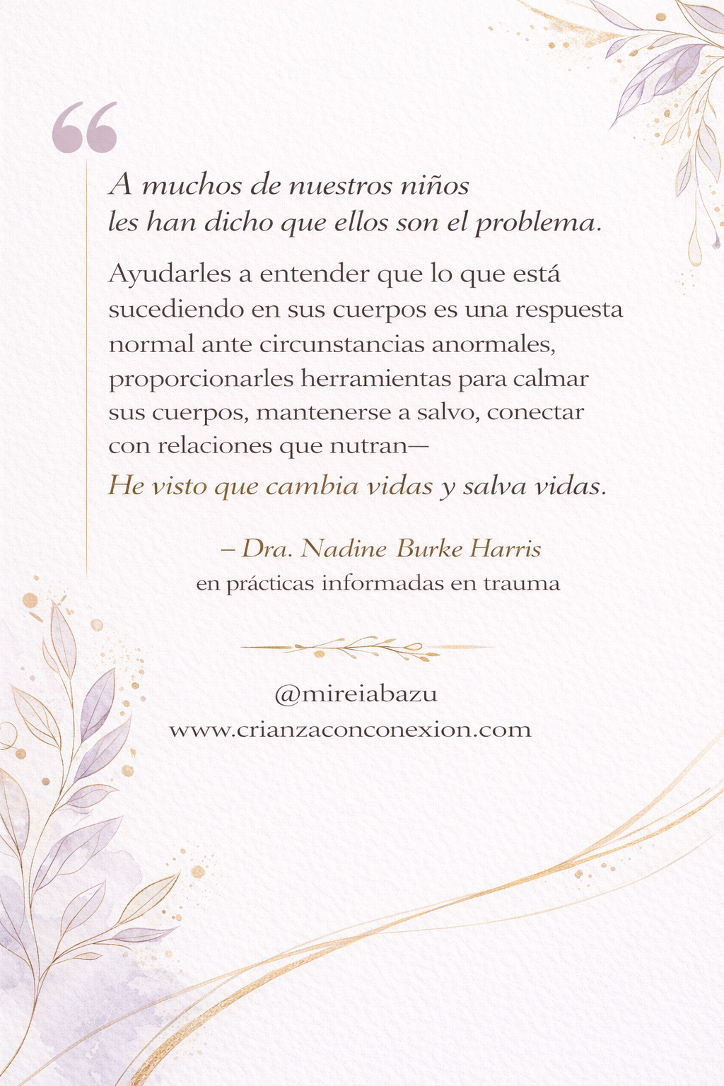 El verdadero cambio ocurre —como dice la cita de la imagen— cuando dejamos de corregir la conducta y empezamos a escuchar al cuerpo. Cuando enseñamos a los niños que lo que sienten tiene sentido, que su sistema nervioso ni ellos están rotos, que pueden aprender a regularse, poco a poco, a través de la conexión, la calma y la seguridad en las relaciones, y aprendiendo a escuchar y entender el lenguaje del sistema nervioso, que nos comunica a cada momento qué necesitamos para mantener nuestra regulación y nuestro equilibrio.